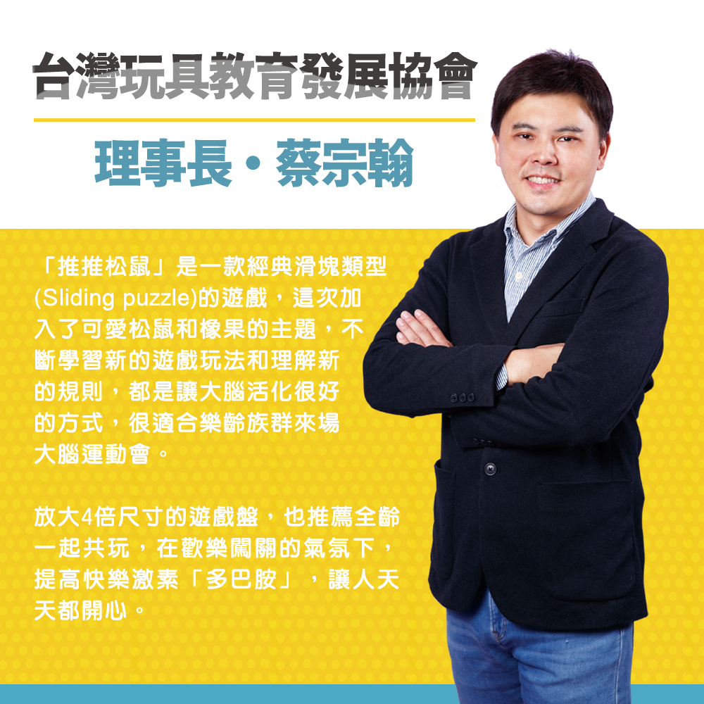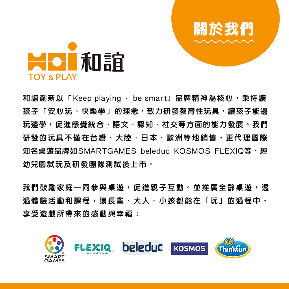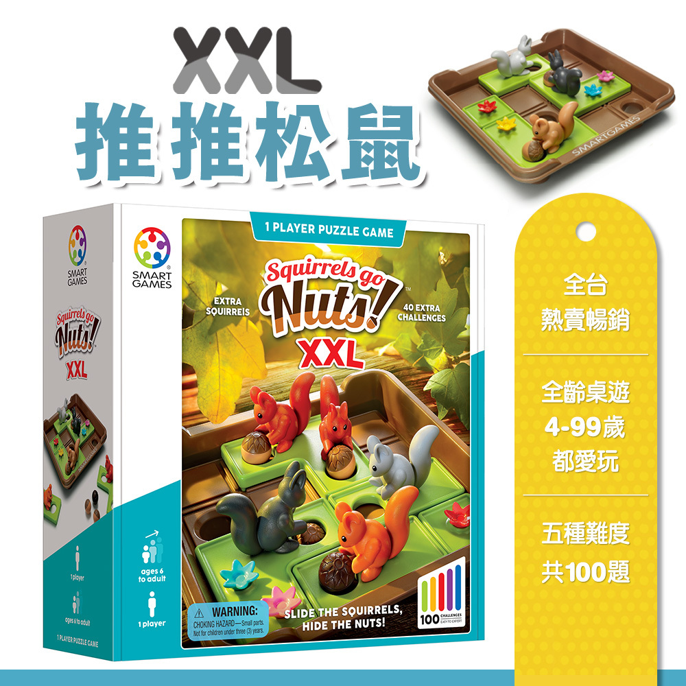 專家推薦 台灣玩具教育發展協會 理事長 蔡宗翰 「推推松鼠」是一款經典滑塊類型(Sliding puzzle)的遊戲,這次加入了可愛松鼠和橡果的主題,不斷學習新的遊戲玩法和理解新的規則,都是讓大腦活化很好的方式,很適合樂齡族群來場大腦運動會。放大4倍尺寸的遊戲盤,也推薦全齡一起共玩,在歡樂闖關的氣氛下,提高快樂激素「多巴胺」,讓人天天都開心。品牌介紹 【和誼創新】 和誼創新以「Keep playing.be smart」品牌精神為核心,秉持讓孩子「安心玩、快樂學」的理念,致力研發教育性玩具,讓孩子能邊玩邊學,促進感覺統合、語文、認知、社交等方面的能力發展。我們研發的玩具不僅在台灣、大陸、日本、歐洲等地銷售,更代理國際知名桌遊品牌如SMARTGAMES、beleduc、KOSMOS、FLEXIQ等,經幼兒園試玩及研發團隊測試後上市。我們鼓勵家庭一同參與桌遊,促進親子互動。並推廣全齡桌遊,透過體驗活動和課程,讓長輩、大人、小孩都能在「玩」的過程中,享受遊戲所帶來的感動與幸福!【SMARTGAMES】 SMARTGAMES來自歐洲比利時,品牌秉持「Keep on playing」的精神,鼓勵孩子透過遊戲,自主探索、體驗和學習,培養解決問題的技巧和能力。SMARTGAMES的每一款遊戲都經過精心設計,要求孩子運用多元的認知能力,進行循序漸進的挑戰與解題,這不僅能啟發孩子各項能力發展,更能在成功解決問題的過程中建立自信,培養勇於嘗試的心態。詳細資料 適玩年齡/6歲以上 出版時間/2025/04 進口商/和誼創新 遊戲品牌/SMART GAMES 產品條碼/4713482022731 內容物/1個遊戲盤、6顆橡果、5個小松鼠拼圖片、1個紅花拼圖片、1本遊戲本(共含100個挑戰關卡) 主要材質/ABS塑膠
