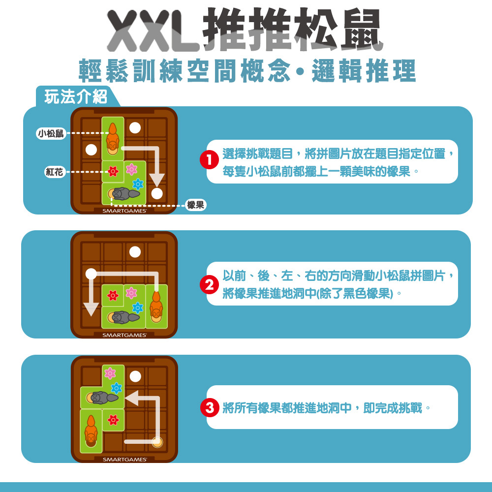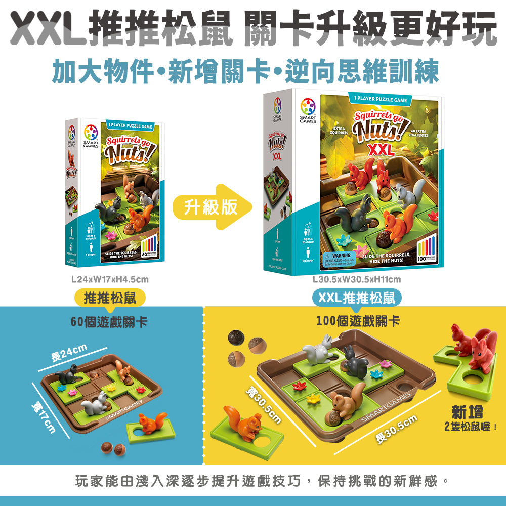 「XXL 推推松鼠」需要觀察盤面上不同形狀的小松鼠拼圖片與地洞之間的位置關係,思考移動拼圖片的順序,設法將橡果推進地洞中。部分關卡,要小心不要將壞掉的橡果掉進洞中,這樣的遊戲設計,可以啟動逆向思維的訓練,在遊戲中提升策略規劃能力,並增進邏輯思考與解決問題的能力。全新40題遊戲關卡,總計共100題挑戰,讓遊戲更加豐富有趣,5種遊戲難度等級,玩家能由淺入深逐步提升遊戲技巧,保持挑戰的新鮮感。