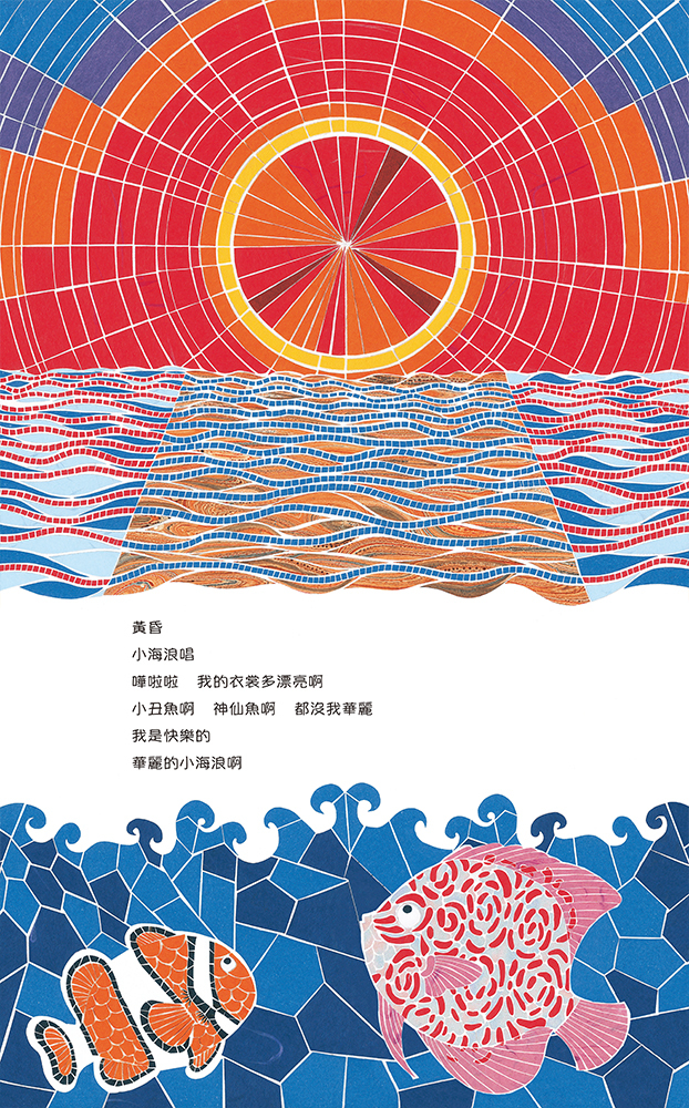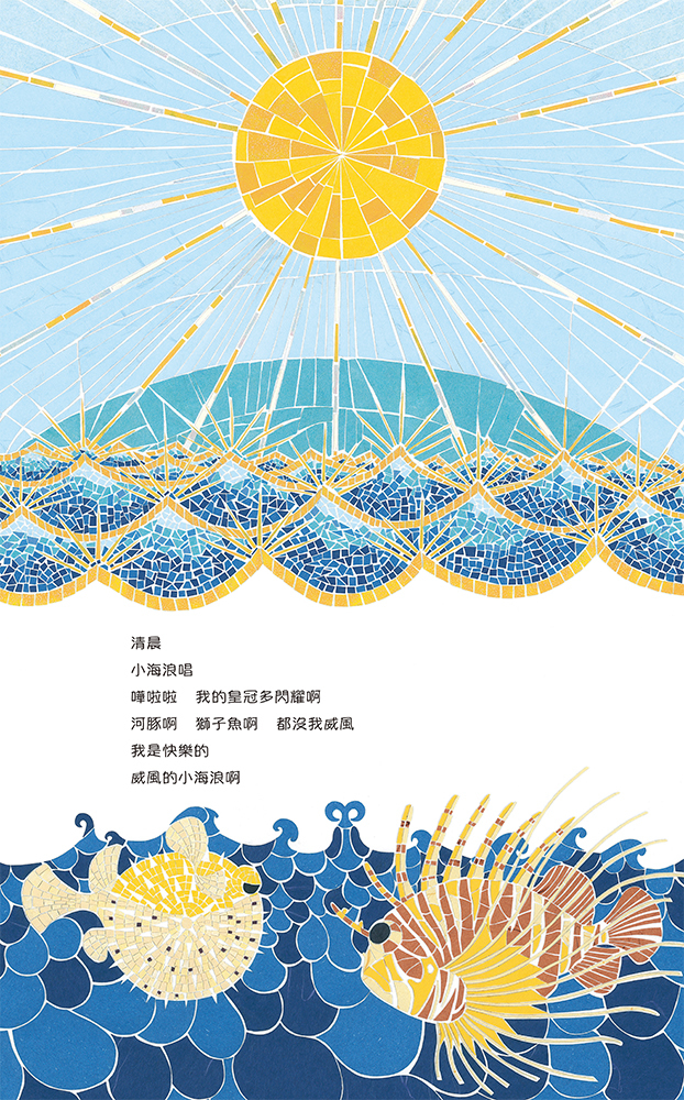 《大海小海浪》運用細膩的馬賽克拼貼技法,如雕琢藝術品般把海浪具像化,以直式的翻頁閱讀設計,從清晨到深夜,從日常到暴風雨來臨,生動捕捉海天輝映之際,每一刻大海小海浪的景致風貌,或璀璨耀眼,或波光粼粼,或澎拜洶湧……充滿力與美的展現,帶給讀者視覺閱讀上的震撼。