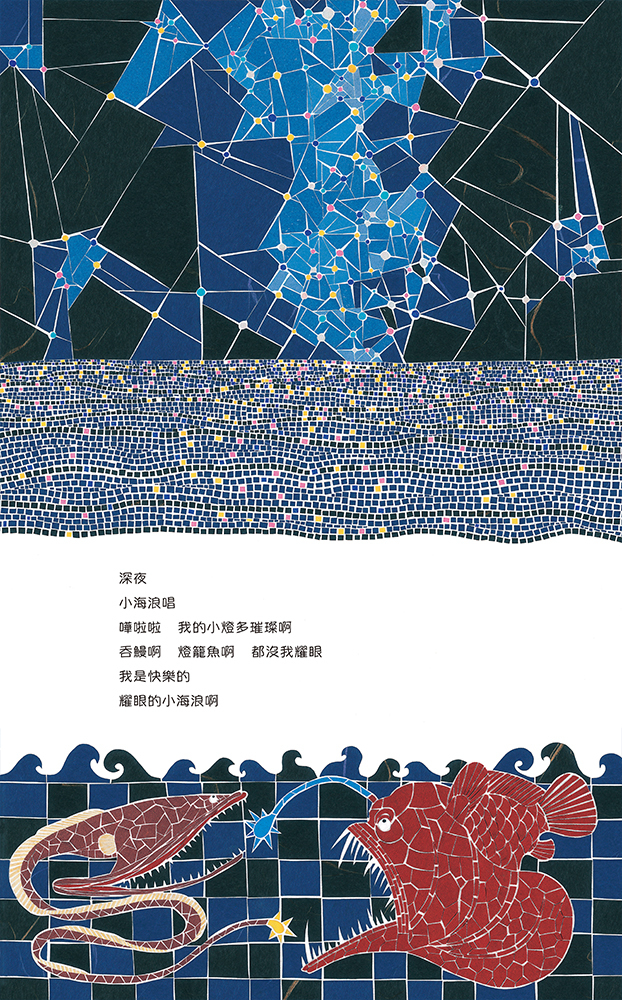 因此當我看到這故事時,立刻被吸引,如此簡單卻道破了恐懼的根源。但對於將其改編成繪本,我還是很掙扎的,原本的故事太簡單了,而且主角是一波海浪!等到故事重新編寫完成,並決定選擇最能傳達故事精髓的馬賽克拼貼來表現後,創作時間整整持續了一年……。當完成作品的那一刻,我很高興我堅持下來了,也希望它能帶給小朋友和大朋友們喜悅。