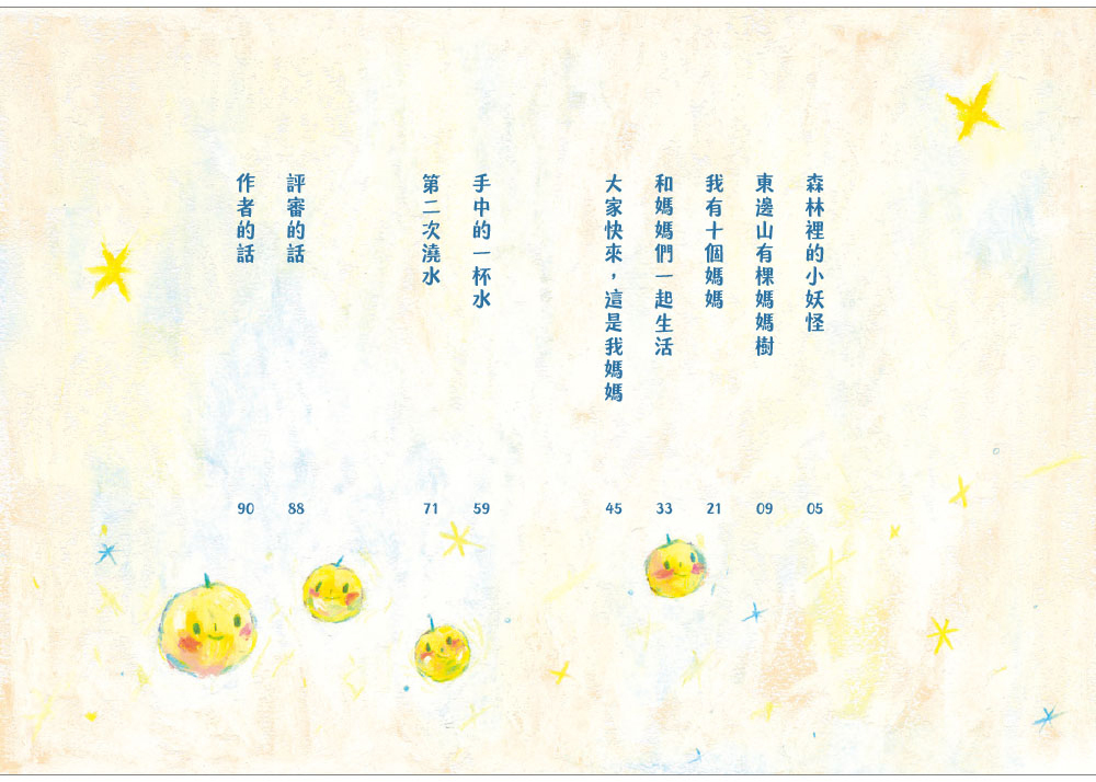 《媽媽樹》故事源於一個再尋常不過的黃昏,溫暖的陽光輕柔灑下,融化在廟口的矮樹叢上,金燦燦的,就在那時,我忽然看見那棵矮樹上頭結了一顆顆又大又圓的人臉果實,還發出了奇怪的叫聲:「媽、媽。」