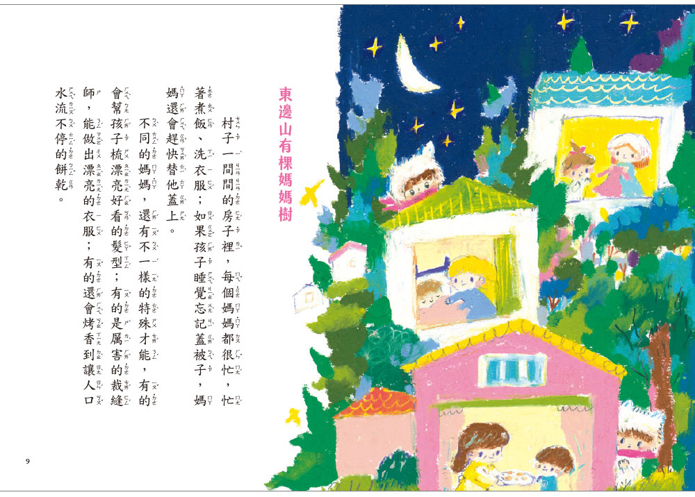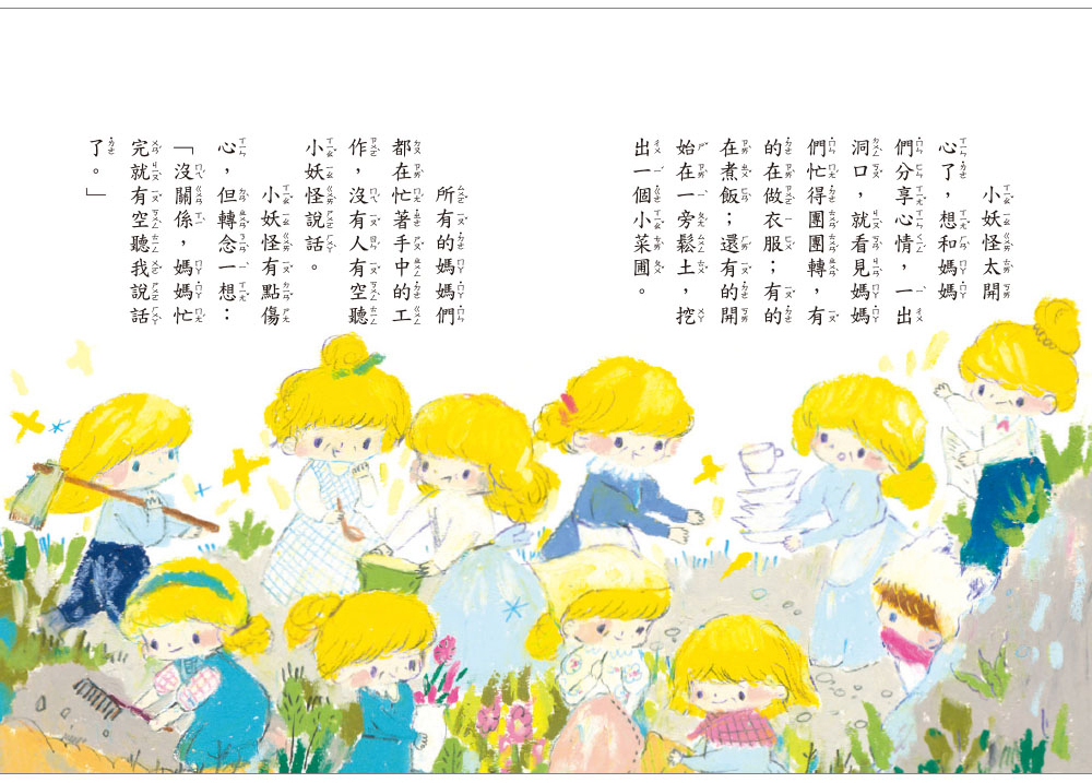 十位媽媽的言行舉止,不論是家務、安慰、傾聽,甚至是指責,描述得極有畫面,所有親子互動的場景,呈現於故事線的每個細節裡,整體氛圍聚焦明確。隨著情節,像是走進每個家庭小劇場,如此熟悉,共鳴極強,但因為是以小孩的真實情感述說,所以並不陳腔老套。比如一開始有媽媽就急著炫耀;被媽媽糾正便惱羞成怒的不要媽媽;失去後的故作堅強,再度得到的不敢置信;小妖怪的情緒起伏,在簡潔卻靈巧的文字裡,絕對能與全天下的親子們合拍有共感。