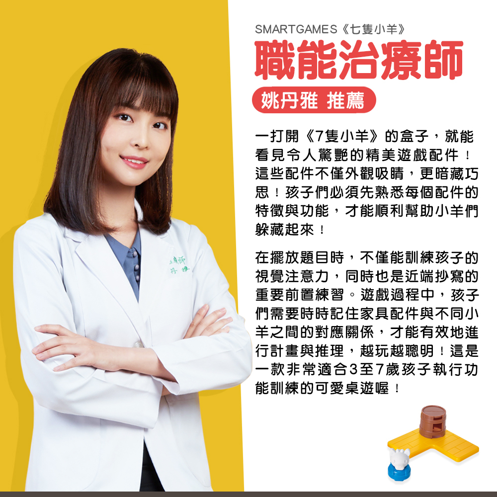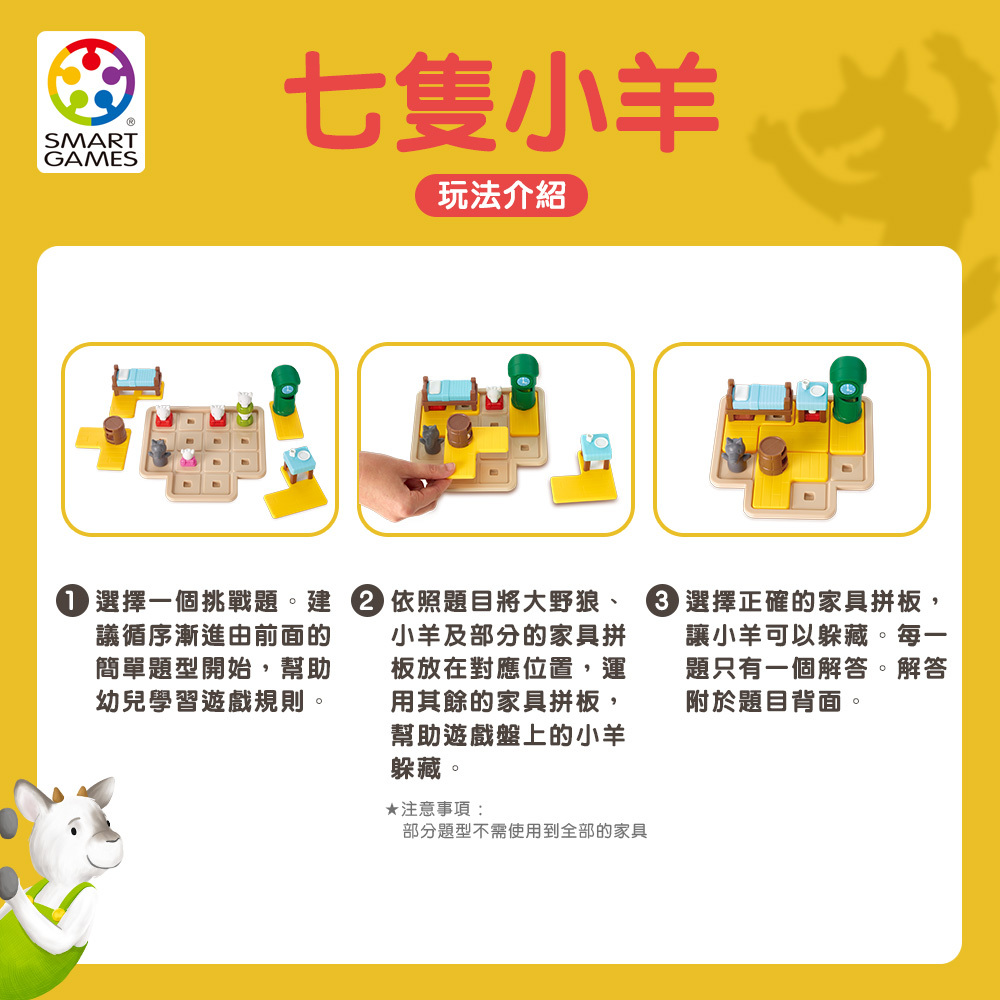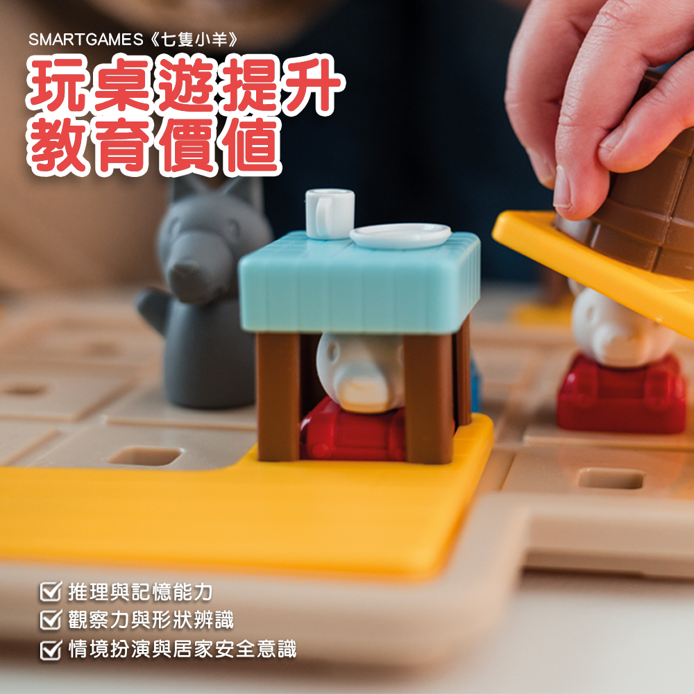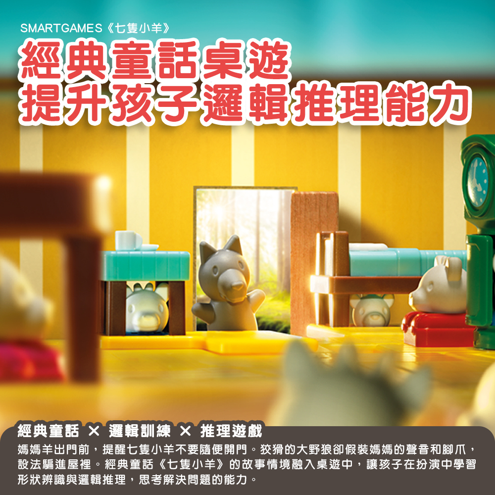 經典童話故事變身桌遊,附贈圖畫故事書,結合故事閱讀與趣味遊戲。栩栩如生的小羊偶與可躲藏的家具,孩子透過故事情節幫助小羊躲避大野狼。自由扮演或題本挑戰兩種玩法,在不斷嘗試中找到正確的躲藏位置,建構空間概念與體會應用,並引導孩子逐步增進邏輯推理與思考解決問題的方式。
