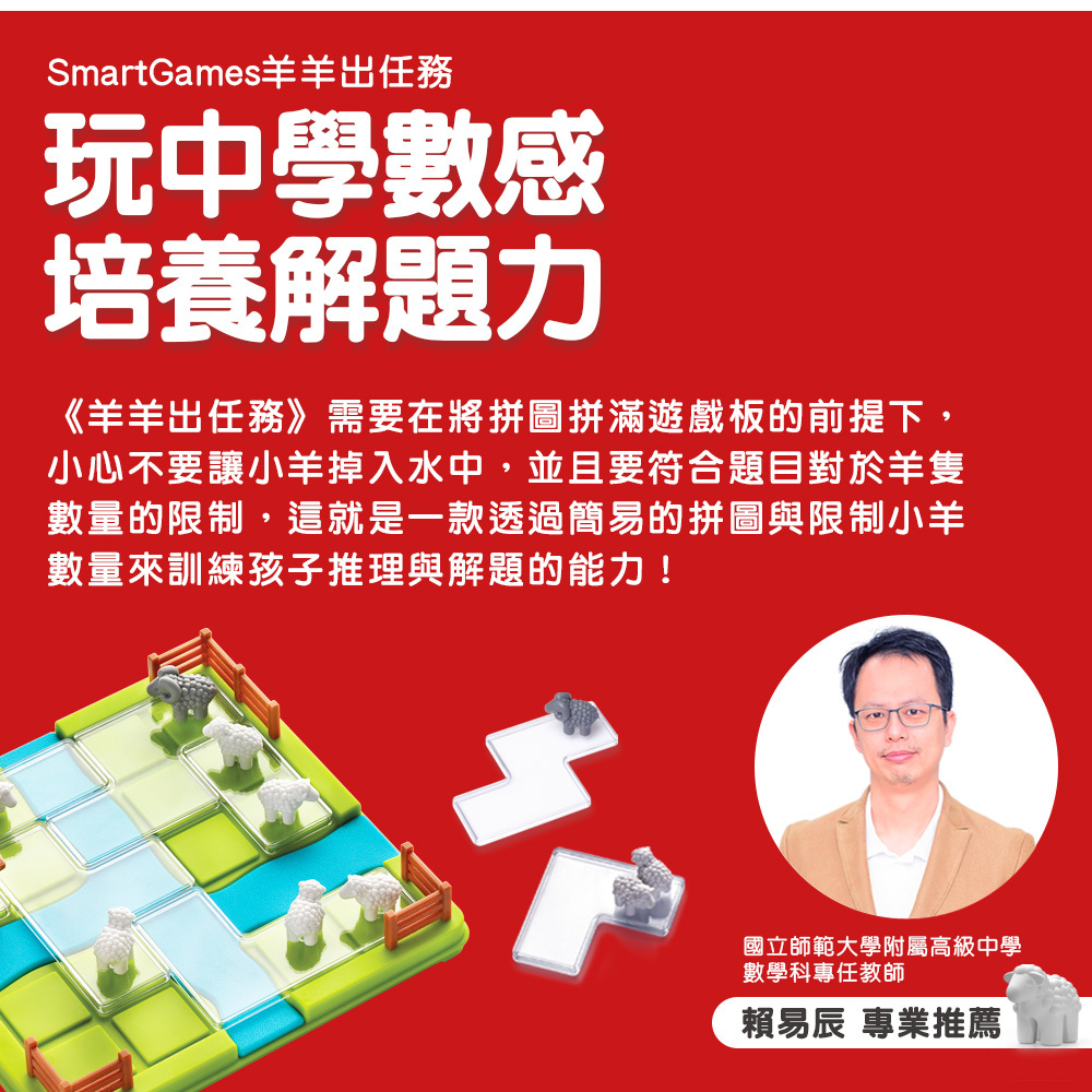 產品特色《羊羊出任務》由SmartGames設計團隊精心規劃,透過「透明拼圖 × 數量提示 × 空間限制」三元素結合,引導孩子在遊戲中培養數量合成與分解、空間配置、邏輯推理與專注力等多重能力。題本共60題,採循序漸進設計,鼓勵玩家在反覆操作與驗證中建立解題策略。可攜式盒蓋設計便於收納與外出攜帶,讓動腦訓練融入日常生活。
