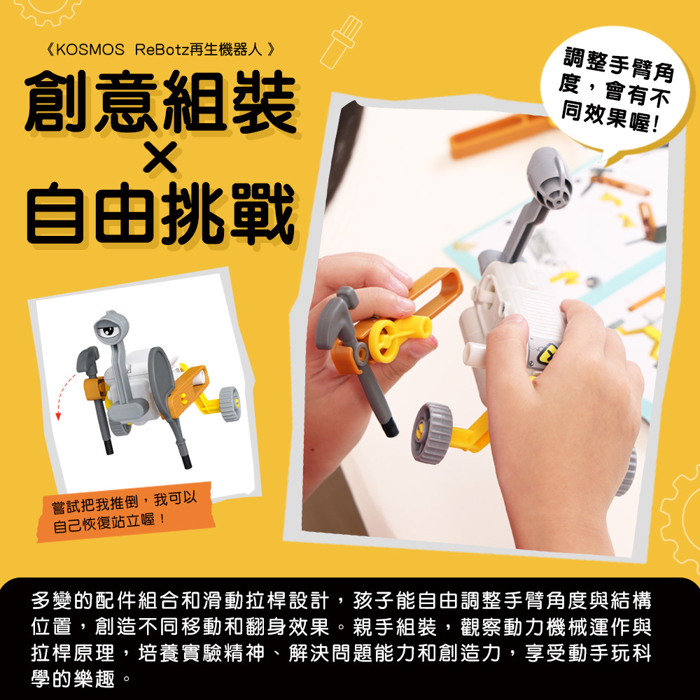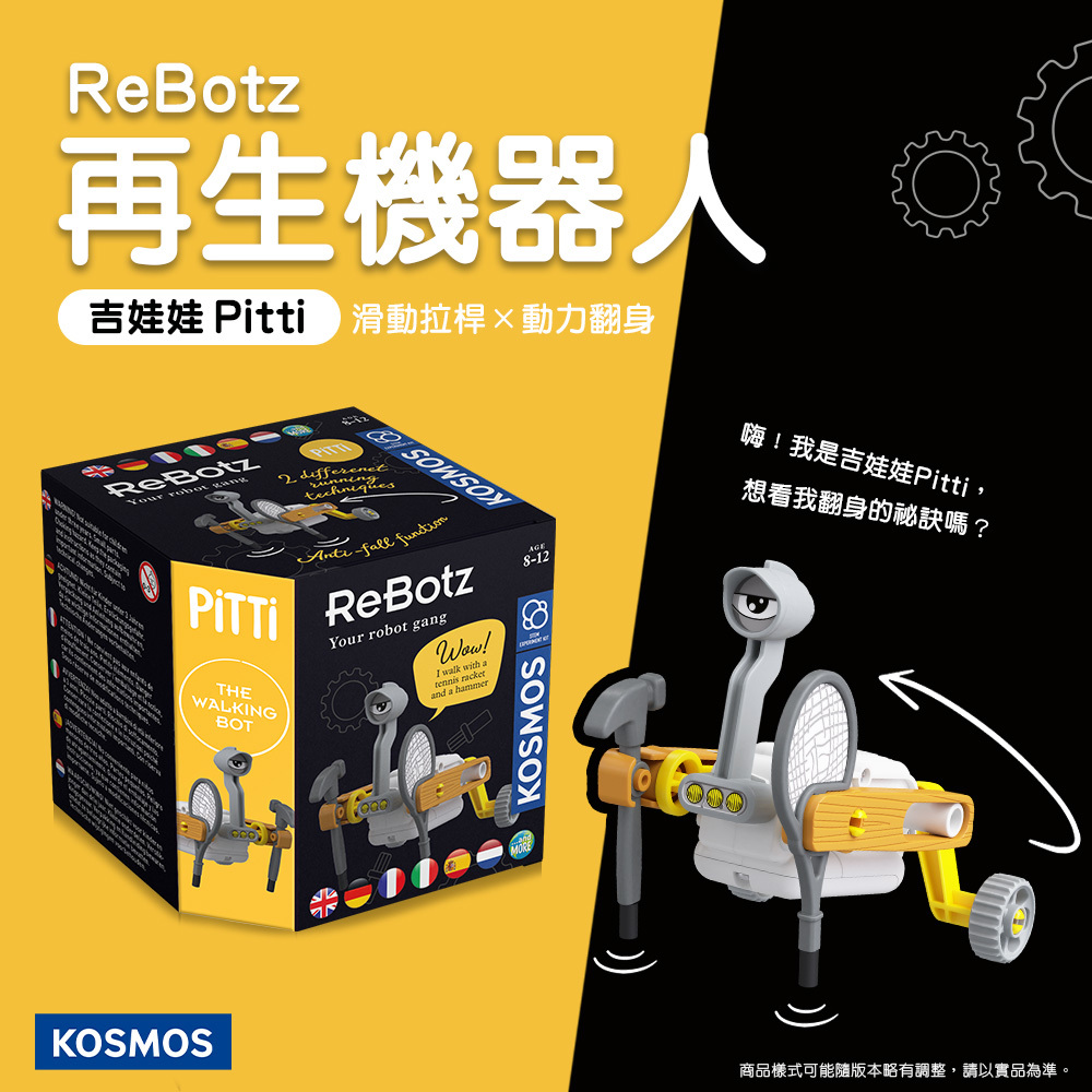 ※遊戲人數:1人自行解題,或2人輪流解題開啟親子、朋友共玩的模式。來自德國 KOSMOS 的 ReBotz 再生機器人–吉娃娃 Pitti 透過「滑動拉桿機構」實現自動翻身,讓孩子在觀察中理解重心轉移與連動原理。左右側板是否固定裝入導向桿中,將影響移動的方式;不小心跌倒了,還會自己站起來!