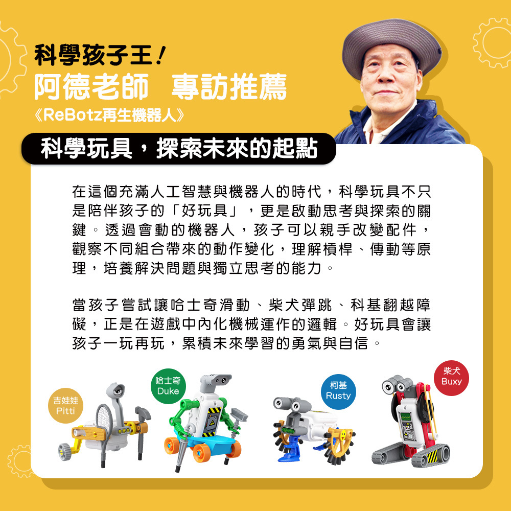 【ReBotz再生機器人-吉娃娃 Pitti】 1. 滑動拉桿 × 動力翻身獨特的滑動拉桿與左右導向桿設計,吉娃娃 Pitti 跌倒後也能自己站起來,自動翻身繼續行進,讓孩子動手操作、觀察重心與連動運動的變化,親身體驗「拉桿原理」的應用,培養實驗精神與探索能力。