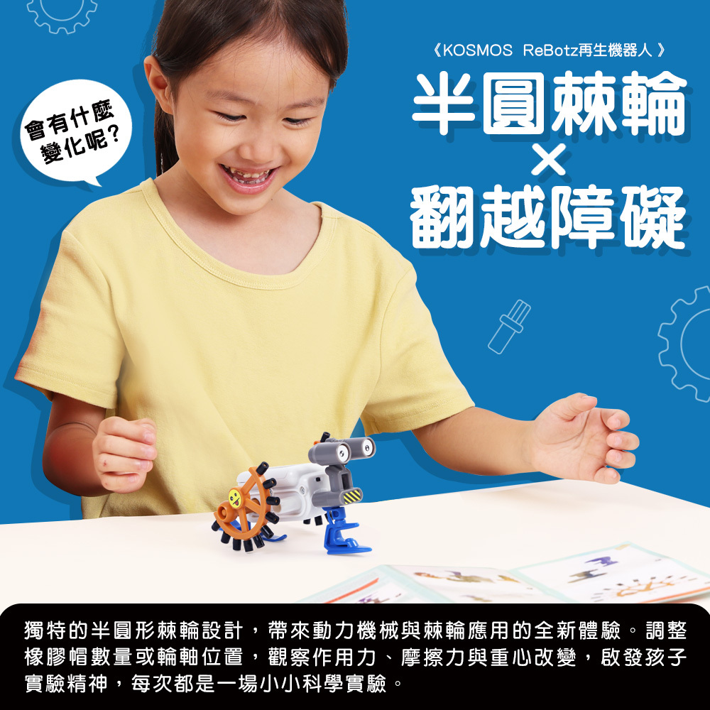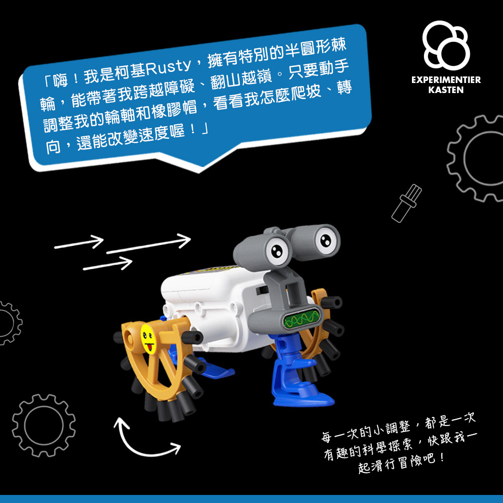 給大人的話引導孩子觀察:為什麼不是圓形的「半輪子」,也能讓機器人順利前進?柯基 Rusty採用特殊的棘輪設計,不僅能翻越障礙、挑戰斜坡,更是認識動力機械與摩擦力的絕佳起點。