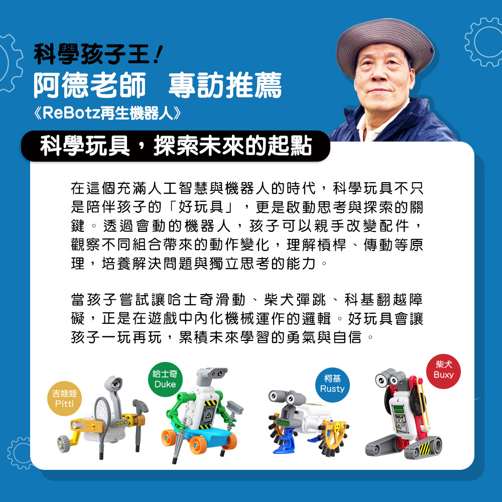4. 全系列探索 × STREAM啟發ReBotz 系列共四款機器人,每款結構與運動原理皆不同,可混搭配件創造獨一無二的冒險夥伴,ReBotz 再生機器人共有四款角色(哈士奇 Duke、柴犬 Buxy、柯基 Rusty、吉娃娃 Pitti),每款擁有不同的動力裝置與機構原理,還能混搭配件創造屬於自己的冒險隊伍,全面啟發孩子在動手中學習STREAM素養與創造力。