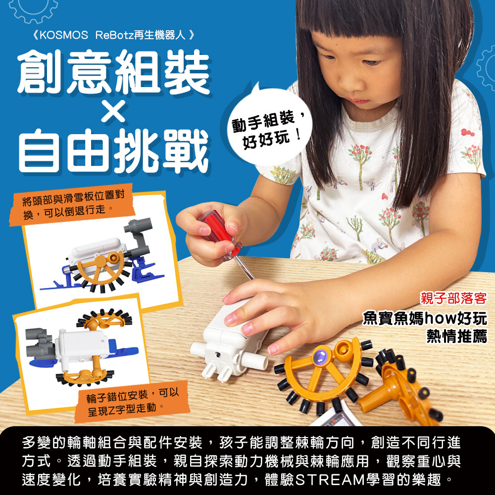 ※遊戲人數:1人自行解題,或2人輪流解題開啟親子、朋友共玩的模式。來自德國KOSMOS的ReBotz再生機器人–柯基 Rusty 是一款運用「半圓形棘輪」實現翻越障礙與斜坡挑戰的創意科學玩具。透過調整輪軸位置與橡膠帽數量,柯基 Rusty 不僅能加速前進,還能彎出獨特的 Z 字型路線!