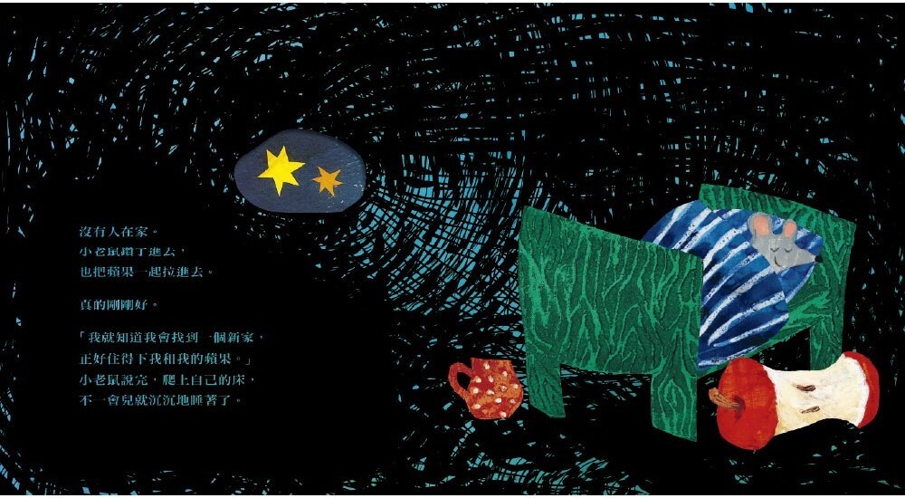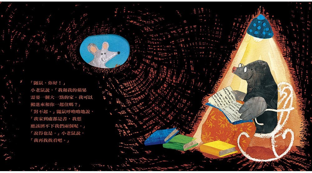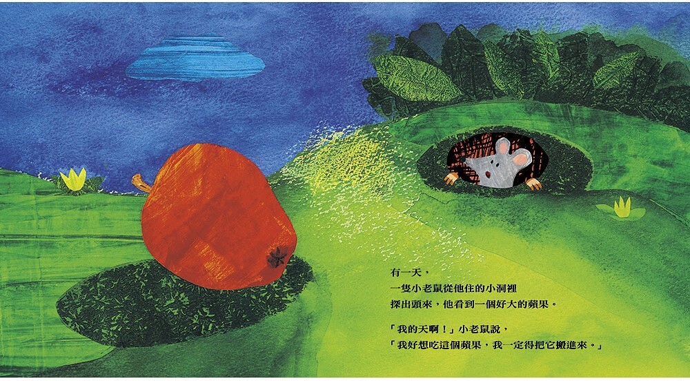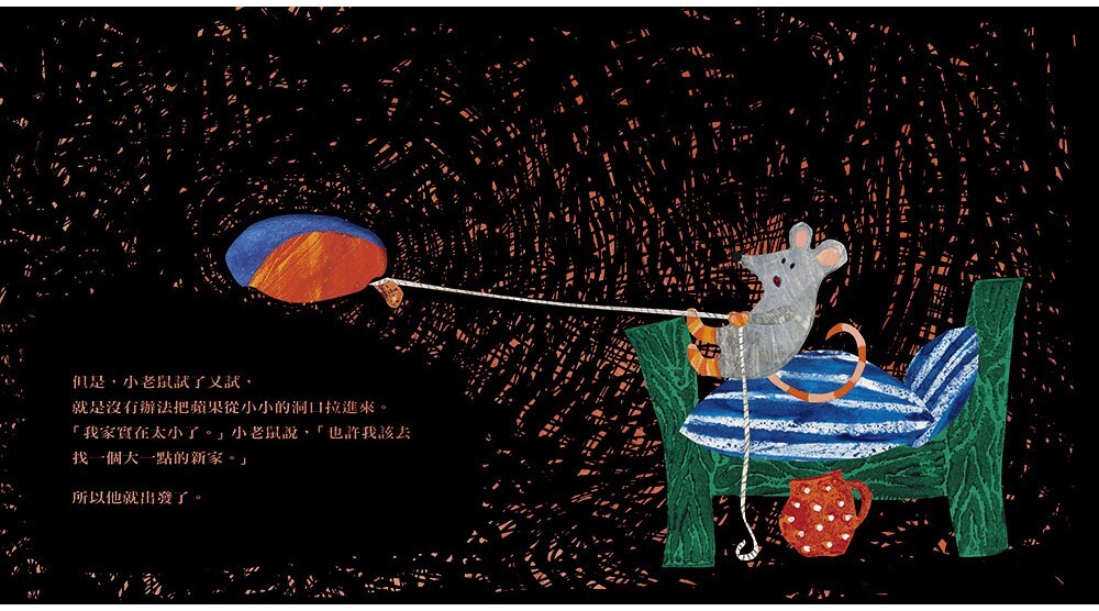 這是一個雙線進行的有趣故事:小老鼠一邊不停地找尋大一點的房子,一邊卻因忍不住飢餓而把蘋果越啃越小。為了凸顯這樣對比的趣味,作者藉由不規則的軋形洞穴設計,讓故事場景在寬廣明亮的戶外與狹窄黑暗的洞穴交替進行,不但巧妙串起了故事軸線與閱讀節奏,更讓整個故事充滿張力。