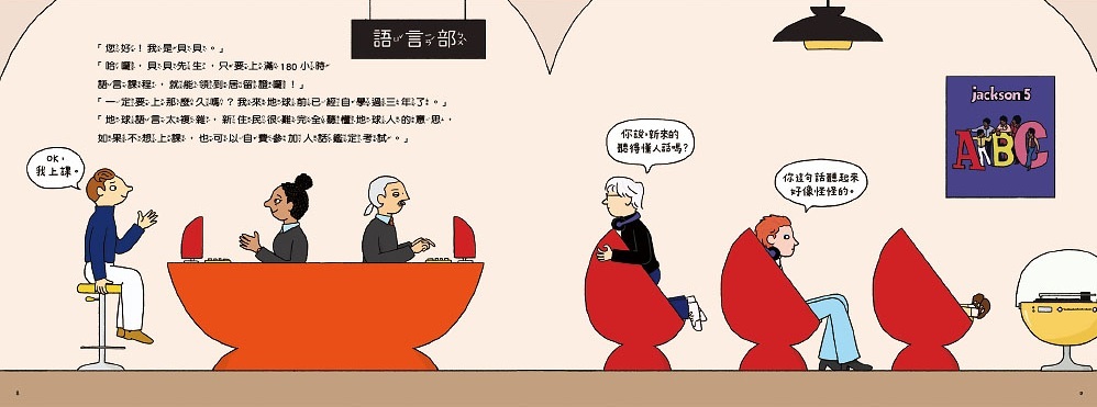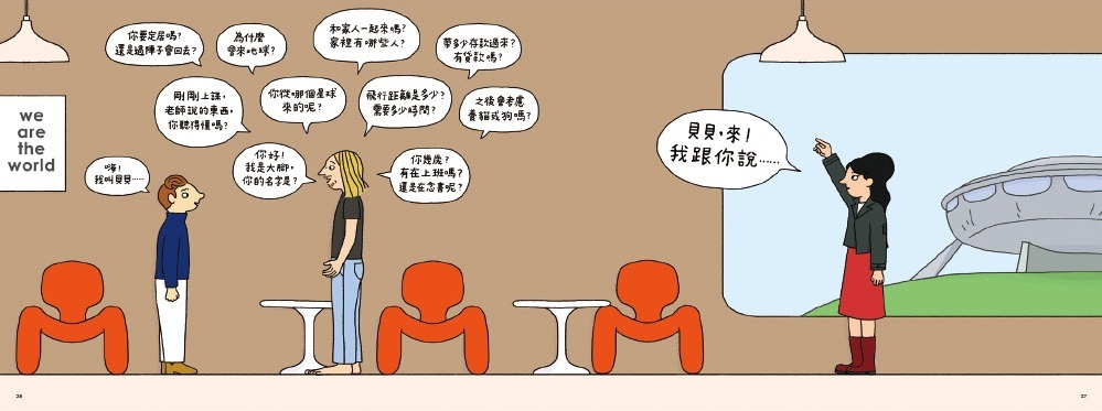 文/海狗房東(作家暨繪本評論家)《來,我跟你說―地球人聽話指南》是一部充滿想像力卻又細膩探究人類語言複雜性的作品。故事設定是「外星人移住地球」的第一天,各種模樣的外星人排隊通過星際海關,要取得地球居留證。打從一開始,科幻喜劇般的氛圍便成功吸引讀者的好奇心。 通關之後,外星人必須先到「外貌部」變裝,穿上人皮和衣裝,但只有外表的喬裝,絕對無法成功融入人類世界,因此,緊接著便要前往「語言部」參加人類語言速成班。自此,進入這件作品的重點─以「來,我跟你說」簡單一句話,發展出各種對話的情境,也帶出同一句話潛藏的不同動機,有些令人無言,有些則流露出體貼和溫暖。 語言不只有表達的功能性,要能順利溝通、交流,發展出更深刻的關係與情感,也必須看透語言的表層,去理解語言背後的情緒、文化、甚至權力等因素。這一概念看似嚴肅,但作者以極富幽默感的故事情節、圖文細節將各種情境示範給讀者看。此外,每一頁圖畫中穿插的對話框,時常以笑點「支援前線」,讓此一主題更添輕快的變奏,也讓全書的表現更具魅力。 整體而言,這件作品以非常新鮮的角度,詼諧地探討說話的藝術與人際互動的奧妙之處;色彩飽滿清爽,既活潑又協調;具辨識度的角色造型也和「怪有趣」的故事相得益彰;在敘事節奏與平面藝術的表現上,皆令人激賞。 最後,此件作品僅只是外星人來到地球展開新生活的第一天,「來,我跟你說」也只是外星人學習語言的第一課。讀完此作,總有意猶未盡之感,無論是擴大篇幅、擴充情節,或是發展成系列,這件完成度已相當高的參賽作品,還有更多令人期待的可能性。