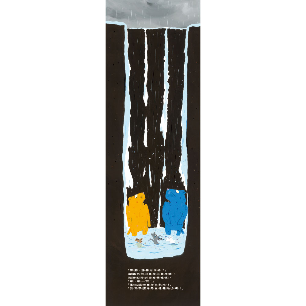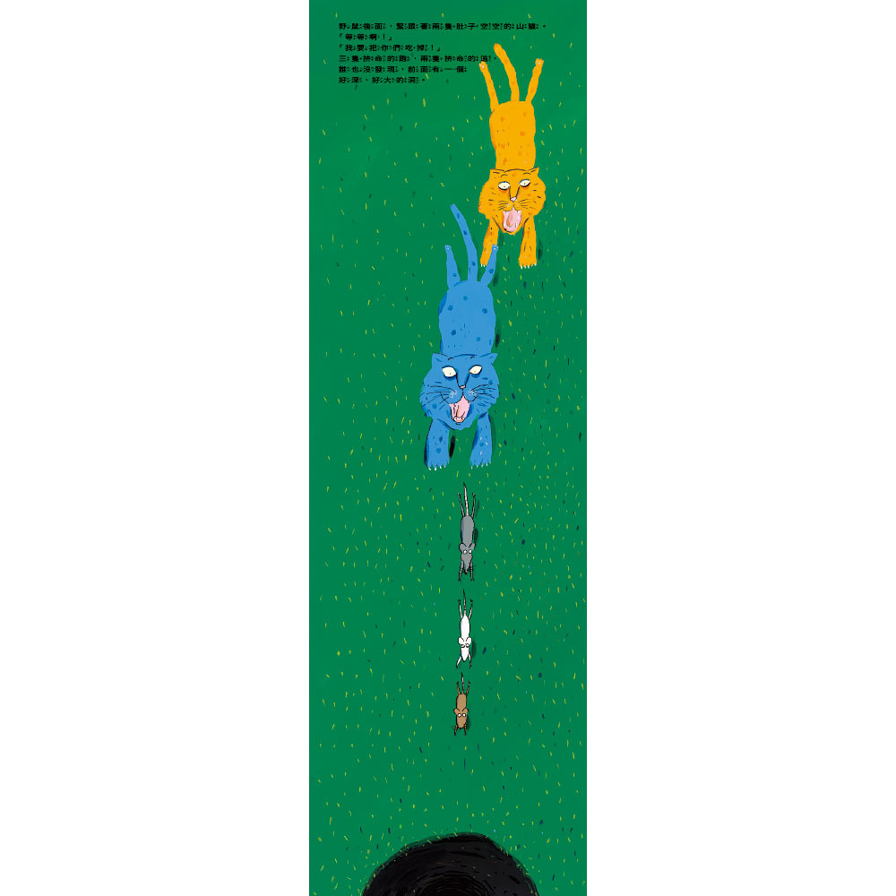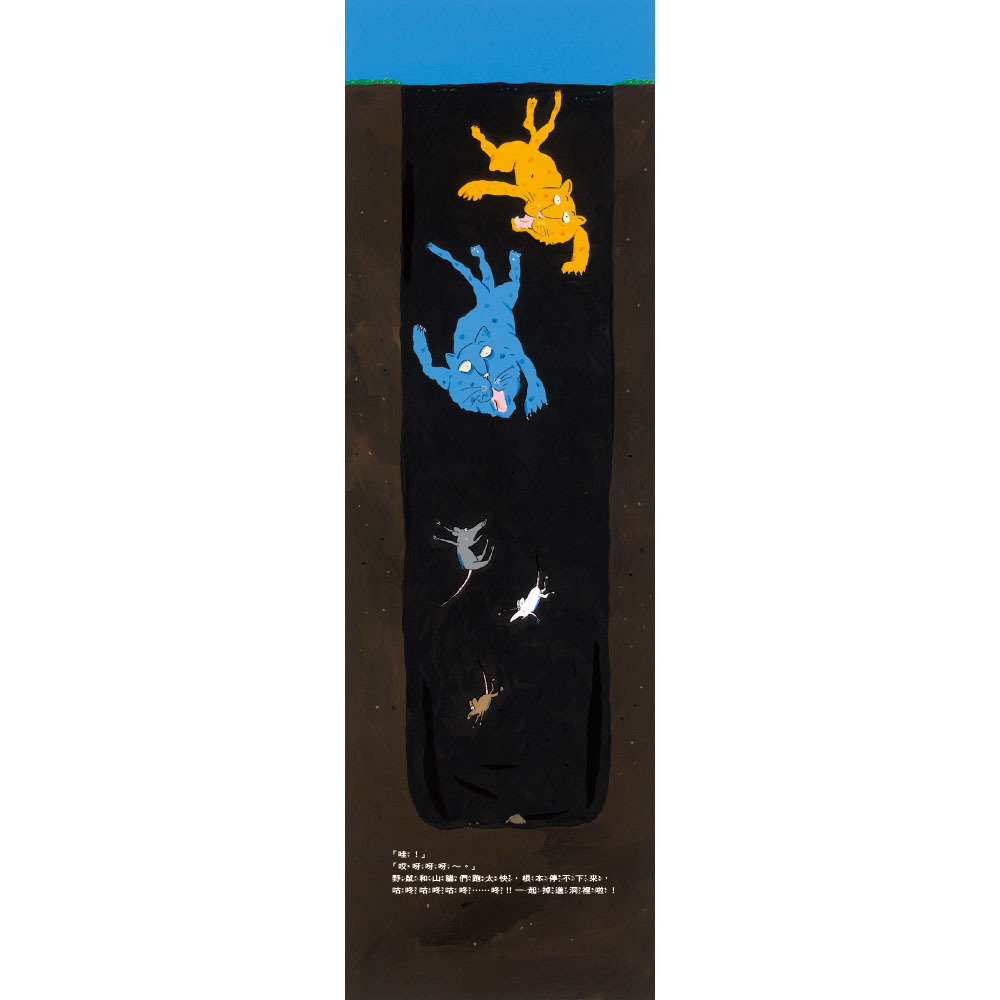 兩隻山貓追著三隻野鼠跑,一不小心,統統掉進洞裡啦!這個洞好深好大,而且又溼又滑,不管怎麼爬,就是爬不出去。