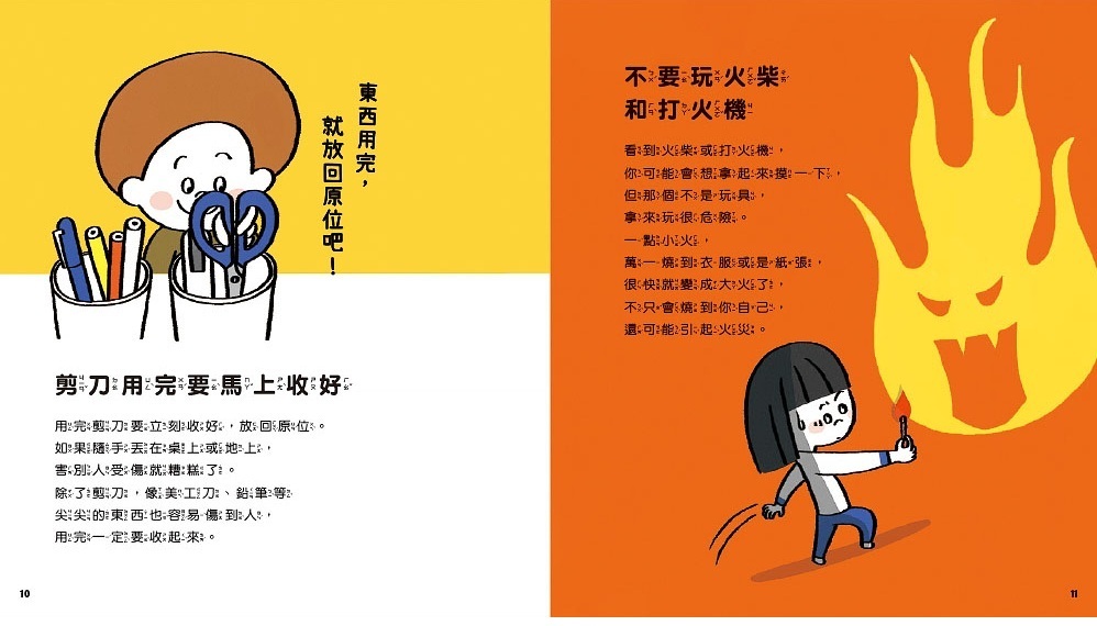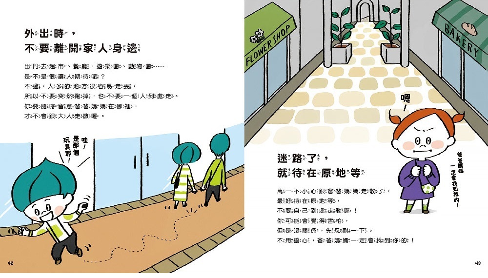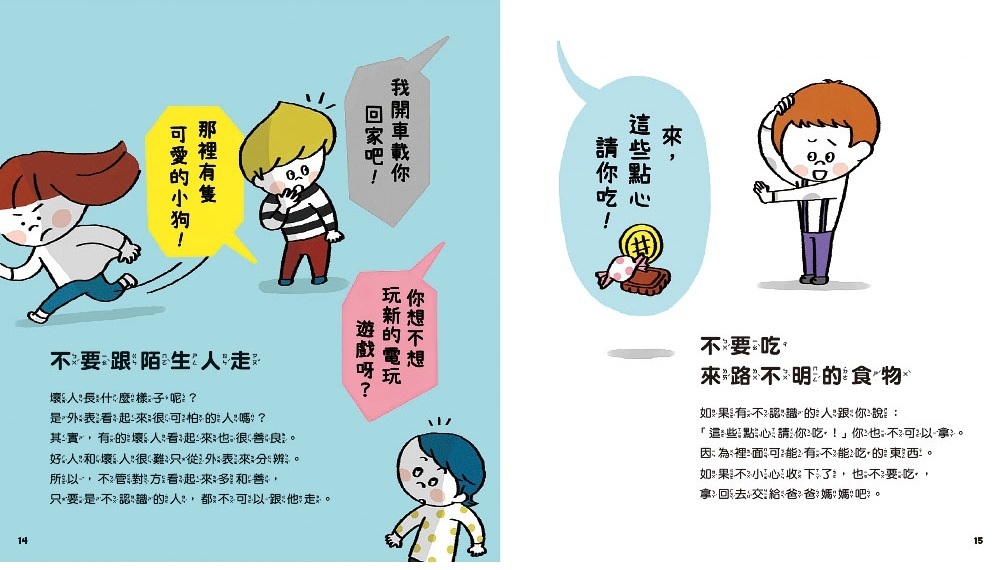 收錄42個安全守則,提升孩子自我保護的能力,讓身心都平安健康。書中的守則包含:不能玩火柴和打火機、坐車時繫好安全帶、保護好自己的身體、不吃陌生人給的食物等。
