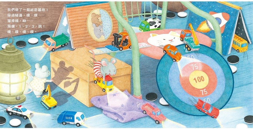 跟著想像力,描繪幼兒的遊戲邏輯本書最可愛的橋段之一,是小汽車探險隊在房間裡打造「秘密基地(遊戲場)」:用盒子變成隧道,用斜板變成溜滑梯,再來一個「1、2、3!」的跳躍。這些畫面,正是幼兒日常遊戲的縮影。