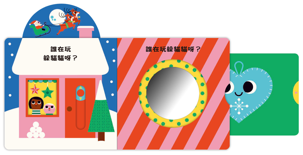 寶寶在閱讀與操作的過程中,需要動動小手找尋躲藏的聖誕節相關事物,不僅能滿足好奇和探索的需求、增加互動與參與感,還可以練習手眼協調和精細動作,學習控制操作的力道、方向。最後的小鏡子對寶寶更是具有莫大的魅力!他們在發展自我覺察的能力時,會開始對鏡中所看到的東西感到好奇,想要伸手去摸或是看著鏡中的自己發笑,隨著拉頁一下出現自己的臉,是給寶寶的最大驚喜,原來自己正是這場有趣躲貓貓遊戲的壓軸主角!