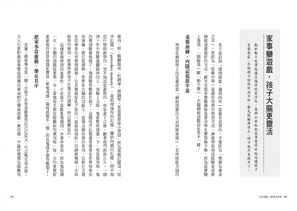 《啟動孩子的大腦》做孩子腦力發展的好幫手父母的關愛是孩子大腦最渴求的東西,把孩子帶在身邊,對他說話、讓他看到你的言行舉止、跟著你一起好好過生活,這就是最好的腦力開發。