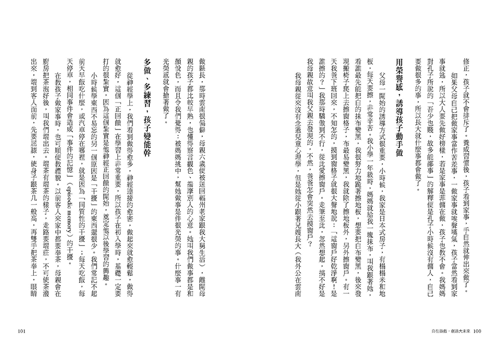 喜歡看洪蘭老師的文章或聽她演講的父母,多半知道柳宗元的〈種樹郭橐駝傳〉。老師時常引用其中一段話:「樹木要長得好,必須其本欲舒,其培欲平,其土欲故,其築欲密,勿動勿慮,順其天性。」教養孩子,希望孩子正直、長得好,也是同樣的道理,必須從小打好基礎、依據孩子的特質給予引導和規範。這些古老的智慧,加上最新的腦科學研究解析,再三印證了人類的種種行為、態度或能力是從何而來、又將往何種方向發展。
