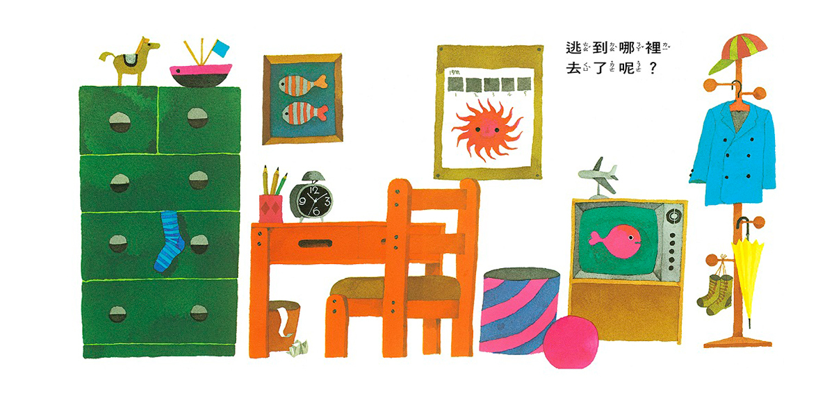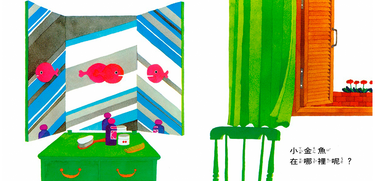 Top2 《小金魚逃走了》看看小金魚和窗簾上的紅點點、花盆裡的紅花、糖果罐裡的糖果,是不是有點像?哪裡像呢?作者以小金魚躲藏的地方,吸引孩子看個詳細,用各種相近的顏色、形狀來培養孩子的辨識能力,引導孩子注意生活環境中的形狀和色彩。更妙的是,小金魚躲到鏡子裡去了!經過鏡子的反射,到底哪一隻才是真正的小金魚呢?整本書的構圖充滿了五味太郎設計的巧思。