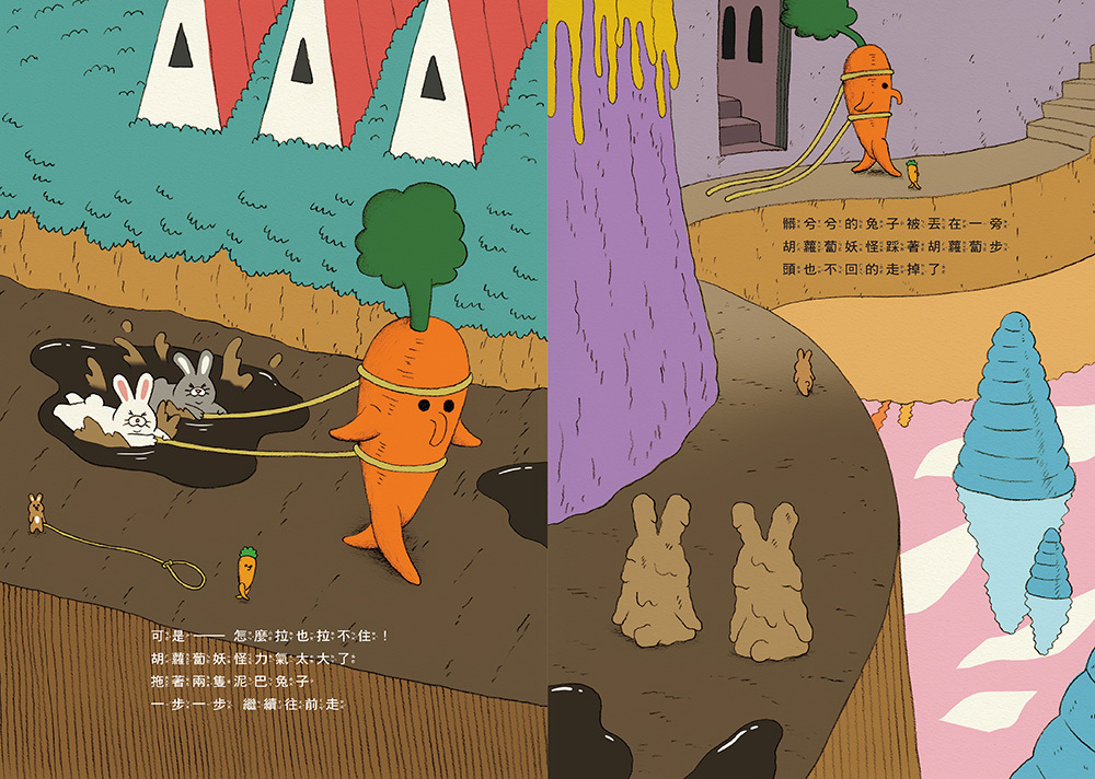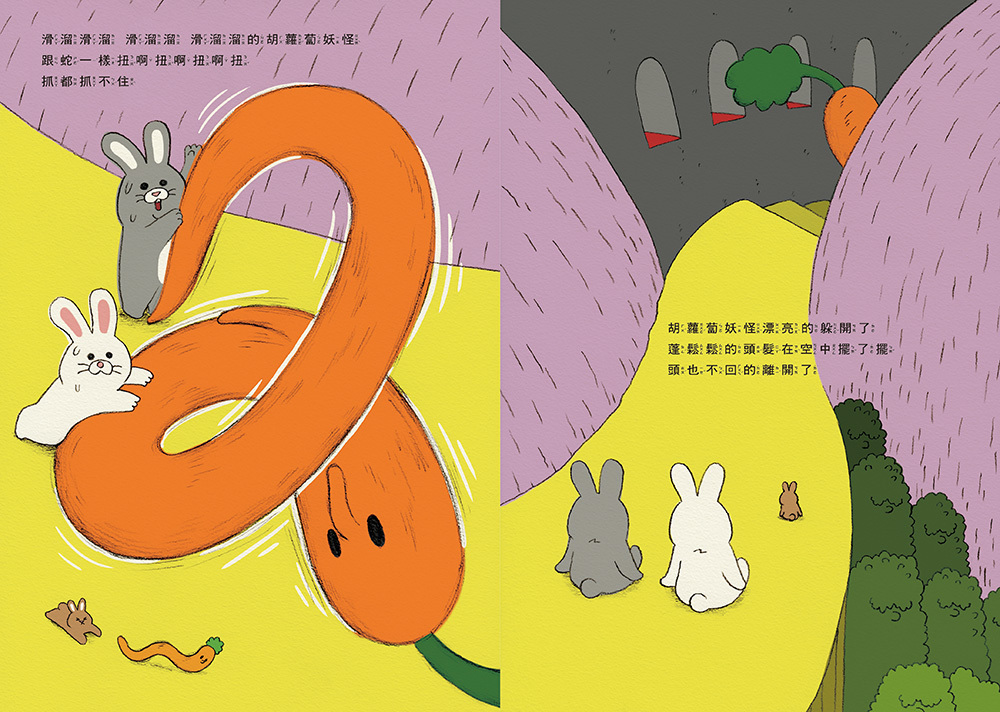 總是不發一語地往前走一天,蹦蹦和跳跳在路上撞見胡蘿蔔妖怪,
