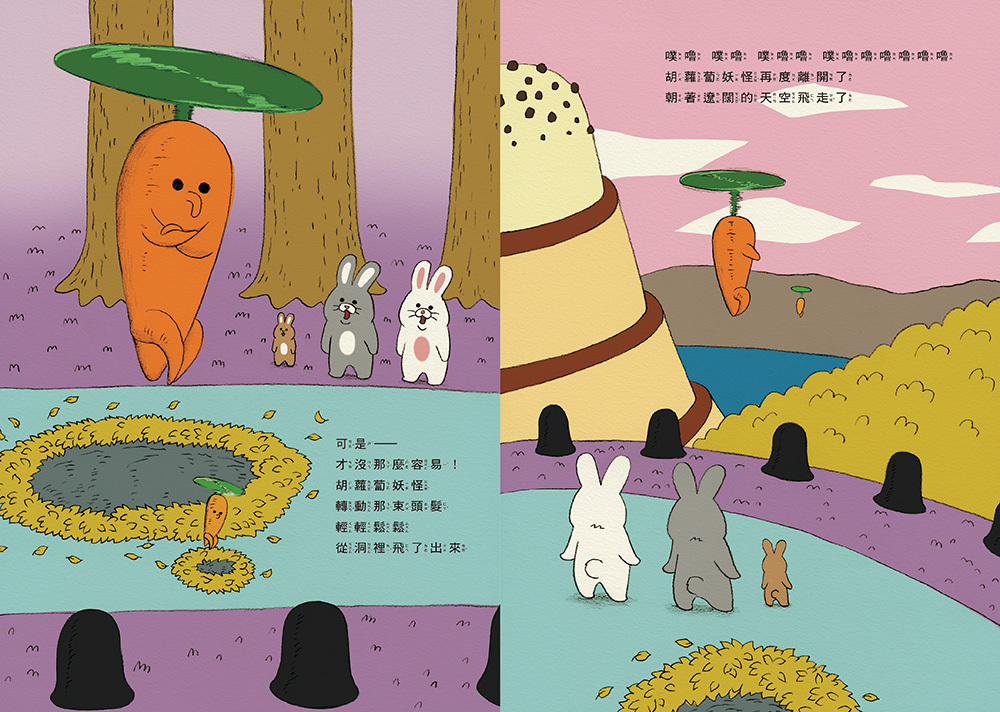「胡蘿蔔妖怪面無表情、悠哉地走著,兔子們則拼命地追趕,形成強烈的對比。孩子們只要看到胡蘿蔔妖怪成功溜走,就很高興。」